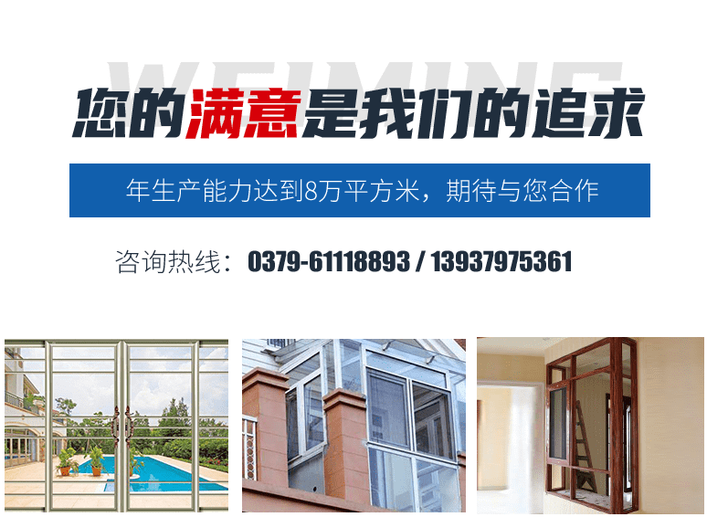 洛陽威明門窗有限公司是一家民營(yíng)企業(yè),企業(yè)位于具有五千年文明歷史的古都洛陽,公司占地五千多平方米,現(xiàn)有職工60余名,其中工程設(shè)計(jì)人員5名,技術(shù)人員12名,經(jīng)過培訓(xùn)的熟練工人21名,公司注冊(cè)資金1000萬元,擁有全套濟(jì)南“西格瑪”鋁合金設(shè)備一套塑鋼設(shè)備一套,主要生產(chǎn)的鋁合金窗、斷橋窗、幕墻、塑鋼窗和各種異形窗、推拉門、防火窗在洛陽門窗市場(chǎng)有著良好的口碑,年生產(chǎn)能力達(dá)到8萬平方米。  洛陽威明門窗有限公司立足中國(guó)國(guó)情,吸收當(dāng)代優(yōu)良技術(shù)之精華,采用國(guó)內(nèi)優(yōu)越的生產(chǎn)工藝,生產(chǎn)的多系列產(chǎn)品,具有結(jié)構(gòu)合理,耐沖擊性強(qiáng)、隔音、隔熱、不變形、耐腐蝕、安裝方便、外觀整潔、裝飾性強(qiáng)等特點(diǎn)。  洛陽威明門窗有限公司在“您的滿意是我們永恒的追求”的經(jīng)營(yíng)理念指導(dǎo)下,從客戶利益出發(fā),全天候?yàn)橛脩籼峁┒嘣?wù),嚴(yán)格加強(qiáng)質(zhì)量管理,嚴(yán)格制定規(guī)章制度,實(shí)行三資企業(yè)的管理模式,采取“三工并存,動(dòng)態(tài)管理”的用人機(jī)制,時(shí)時(shí)進(jìn)行觀念創(chuàng)新、機(jī)制創(chuàng)新、管理創(chuàng)新、技術(shù)創(chuàng)新,形成了一套完善的管理體系,具有較高的管理水平。  我公司以精密的加工設(shè)備為保障,以優(yōu)良的產(chǎn)品,完善的服務(wù)動(dòng)力,是質(zhì)量如生命,堅(jiān)持“安全為先,質(zhì)量可靠,用戶為尊”為宗旨,竭誠為廣大用戶服務(wù)。